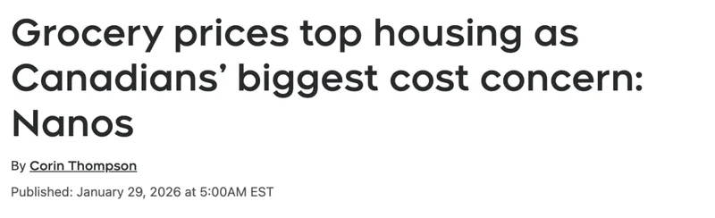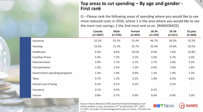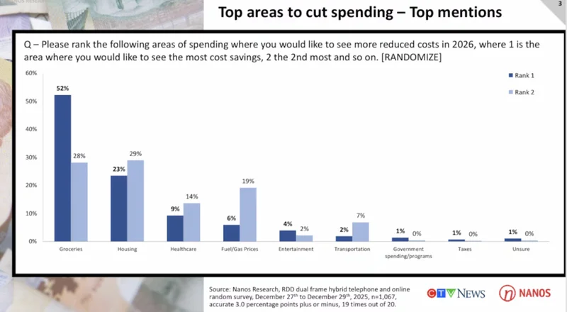 根据 Nanos Research 为 CTV News 进行的一项最新民调显示:杂货价格已经超过住房成本,成为加拿大人当前最迫切希望“降一降”的开支项目。