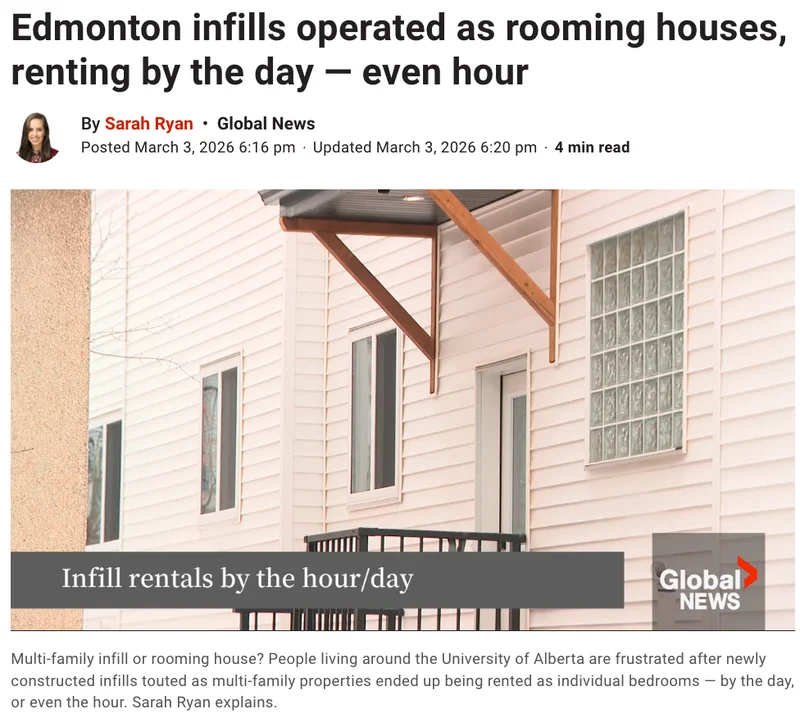 近日,加拿大阿尔伯塔省一则关于新建住宅的新闻引发广泛关注。当地居民发现,一些靠近 University of Alberta(阿尔伯塔大学) 的新建 infill housing(填充式住宅开发) 项目,虽然在规划审批中被称为普通多户住宅,但实际运营方式却接近“房间出租屋(rooming house)”,甚至出现按天、按小时出租单个卧室的情况!
