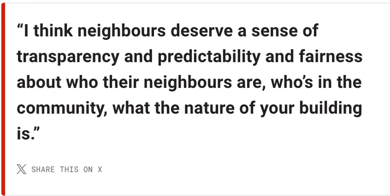 Janz表示,这样的行为确实令人产生疑问。他认为,社区居民理应拥有基本的透明度和可预测性,了解自己的邻居是谁、周围建筑的性质是什么。