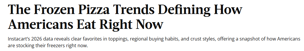 近日,Instacart发布的2025年度报告显示,在生活成本增加与下厨疲劳的双重压力下,冷冻比萨已成为美国家庭的长期刚需。数据来自该平台2025年售出的所有冷冻披萨产品,并与2024年的数据进行了对比。