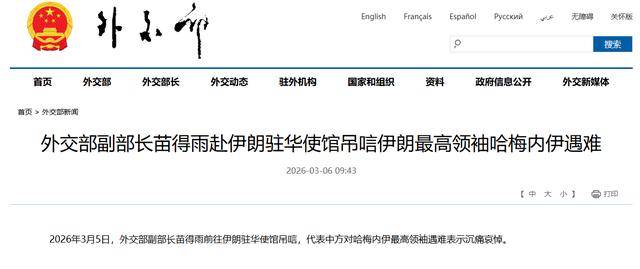 2026年3月5日,外交部副部长苗得雨前往伊朗(专题)驻华使馆吊唁,代表中方对哈梅内伊最高领袖遇难表示沉痛哀悼。