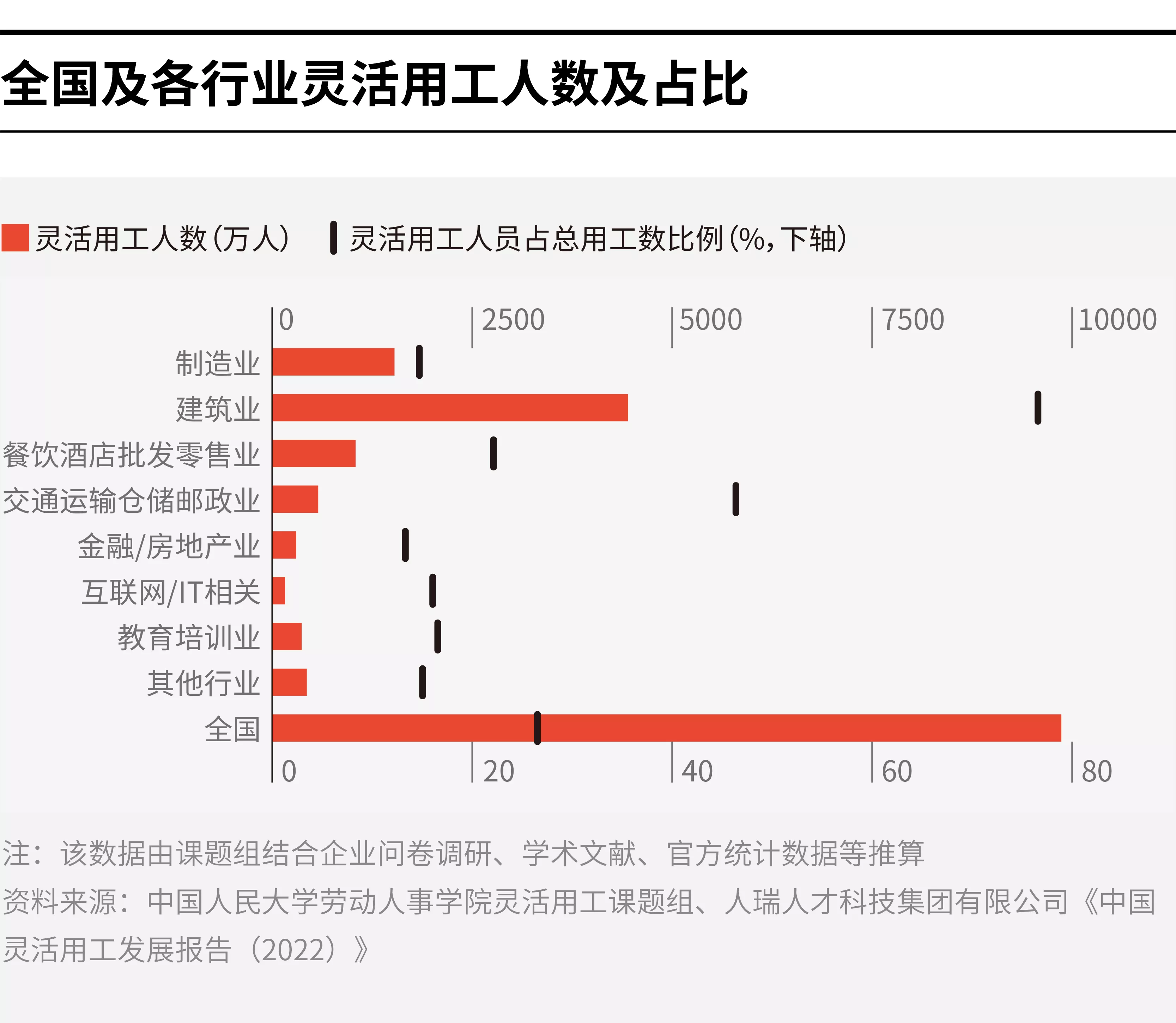 从不同行业情况看,《中国灵活用工发展报告(2022)》显示,建筑业的灵活用工人员占行业总用工数的比例最高,达到76.6%。交通运输仓储邮政业的灵活用工人员占比超过46%,随后是餐饮酒店批发零售业(22.15%)和制造业(14.73%)。由于从业人数规模大、灵活用工人员占比高,全国约45%的灵活用工人员集中在建筑业。