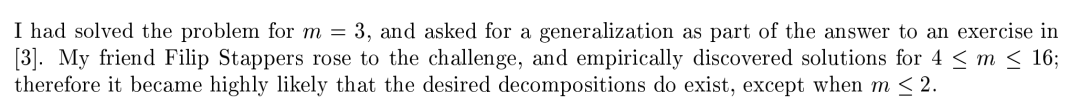 Knuth 自己只解出了 m=3 的情况,他的朋友 Filip Stappers 也只通过实验找到了 4≤m≤16 的解,虽然能确定 m≤2 时无解,但通用的分解方法一直是个谜,妥妥的数学界开放难题。