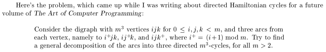 Knuth 大佬研究的这道题,是为他的经典著作《计算机程序设计艺术》后续卷册准备的,核心是有向哈密顿环的分解问题,说白点就是一个超复杂的三维有向图问题: