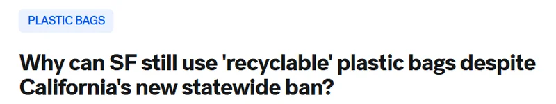 加州新法(SB 1053)于今年元旦起实施,明令禁止任何商家赠送或销售塑料袋,包括此前被标注为“可回收”的加厚塑料袋。然而,记者在旧金山Mission区走访时发现,这类加厚塑料袋供应并不短缺——而它们恰恰是州法两个月前刚刚禁止的品类。