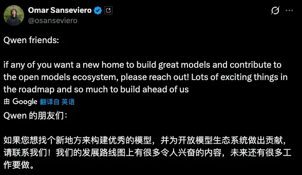 3月5日,谷歌DeepMind开发团队相关负责人Omar Sanseviero在社交平台喊话Qwen(千问)的朋友们:“如果您想找个新地方来构建优秀的模型,并为开放模型生态系统做出贡献,请联系我们!我们的发展路线图上有很多令人兴奋的内容,未来还有很多工作要做。”