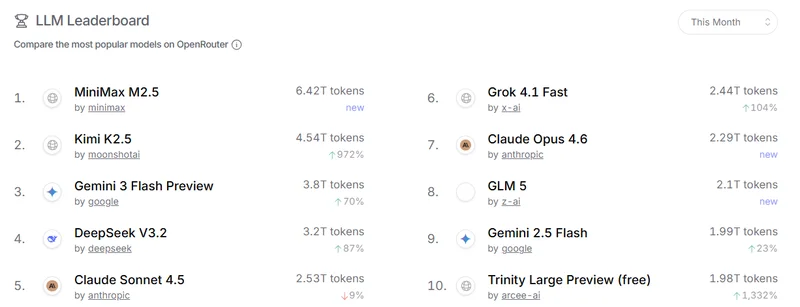 其中M2.5以6.42万亿Tokens的调用量登顶第一,K2.5环比暴增十倍,DeepSeek V3.2实现近90%的增长,GLM5位于第八,阶跃星辰新开源模型Step3.5 Flash快速冲到第12名。