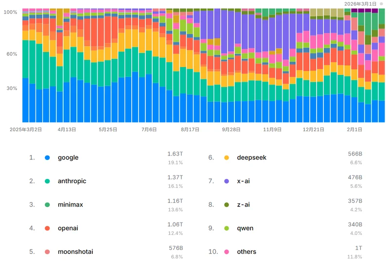 从企业层面看,该平台一年前呈现出美国主导的双寡头格局,谷歌和Anthropic合计占据超过70%的市场份额,国内仅有DeepSeek和千问单列,合计占比约11%。