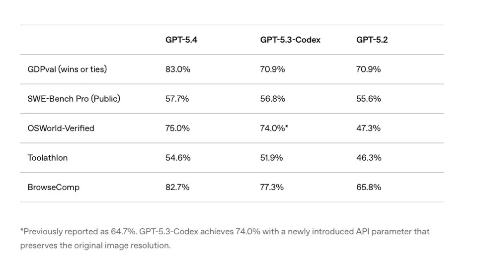 跑分印证了这一点:GDPval基准测试中,GPT-5.4在83%的任务上达到或超过行业专业人士水平;OSWorld桌面操控测试成功率75%,首次超过人类基线(72.4%);编程能力与GPT-5.3-Codex持平,世界知识比GPT-5.2更强。