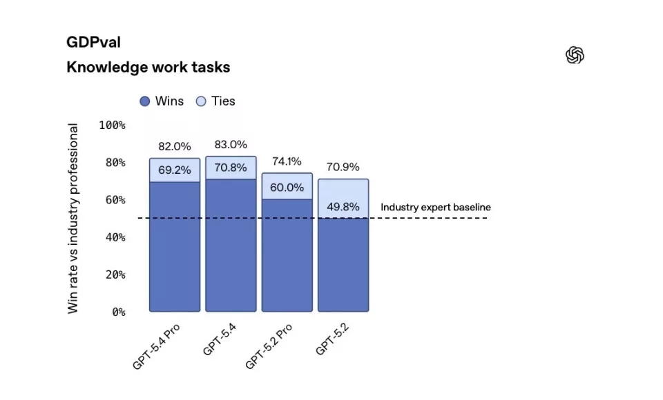 GPT‑5.4 与前代模型在GDPval基准测试中的对比