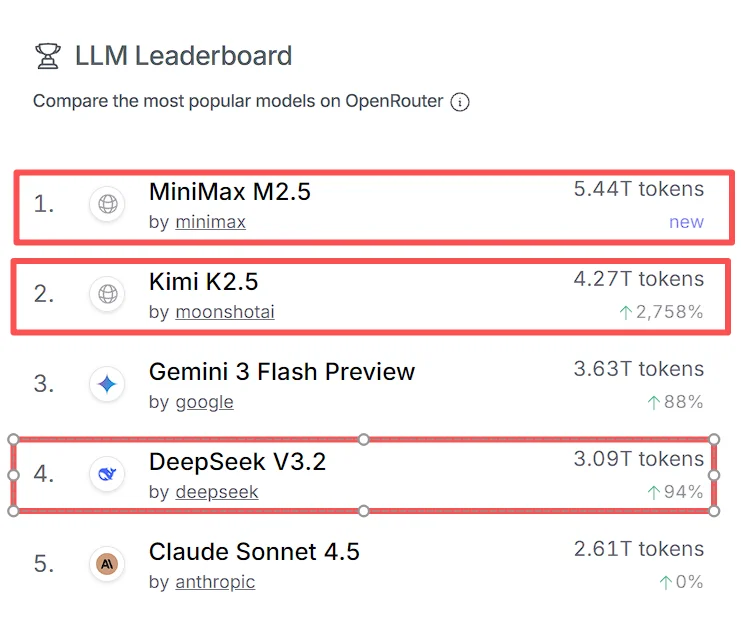 过去,这个指标被美国垄断,GPT系列、Claude、Gemini,长期霸榜。但2026年2月,局面被彻底改写,全球前十模型总Token消耗量突破28.7万亿,其中,中国国产模型贡献14.69万亿,占比51.2%,首次实现全面反超。