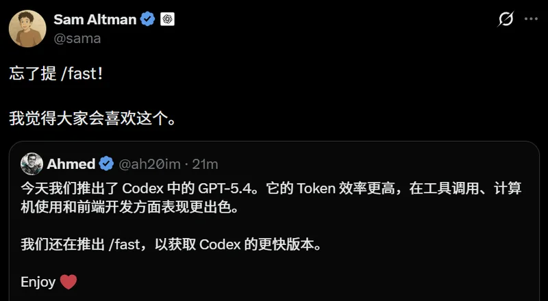 开发者端:GPT-5.4接入API与Codex,并附带极速版GPT-5.4 fast