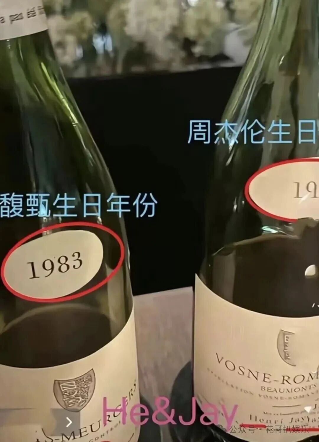 最近又有cp粉发现之前周杰伦曾在社交平台发过一张拍了两瓶红酒的照片,这两瓶酒分别产于1979年和1983年。1979是周杰伦的出生年份,1983恰好是田馥甄的生日年份,怎么看都不像是单纯的巧合。更让遐想拉满的是,这条动态刚发布没多久就被悄悄删除,欲盖弥彰的操作,直接给CP粉递上了铁证,觉得是周杰伦藏不住自己的心意,暗戳戳怀念白月光。