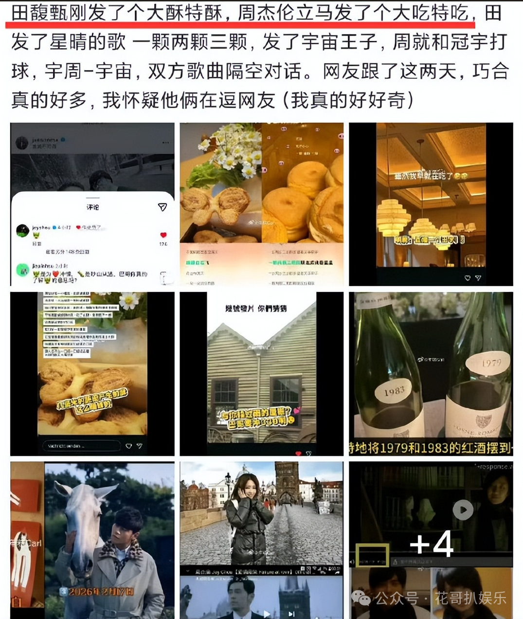 一波未平一波又起,田馥甄在ins分享美食,配文“大酥特酥”,乍一看没什么稀奇的,短短几小时后,周杰伦紧跟发文“大吃特吃”,句式对仗,节奏同步,宛如情侣间的专属摩斯密码。网友们彻底坐不住,翻出两人早年合作、同台互动的细节,逐帧拆解MV、逐字分析歌词,把十几年前的点滴互动拼成隐秘恋情证据链,从《退后》的荧幕情侣感,到歌词里的藏头暗语,每一处都被解读成双向奔赴的深情。