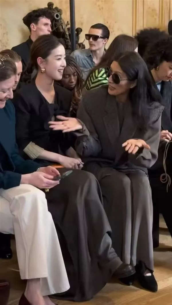 而章泽天坐在中间听两人聊天,随后开怀大笑,其端庄优雅,气质完全不输两位模特。