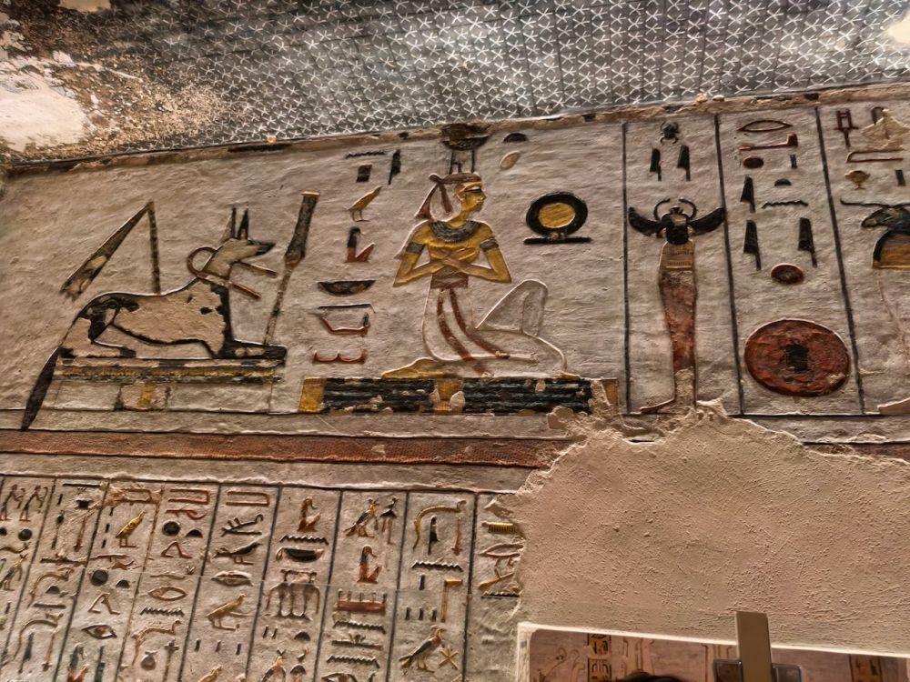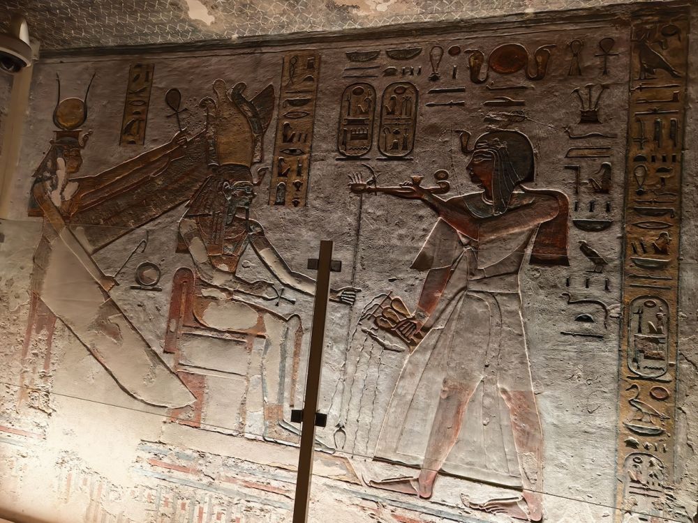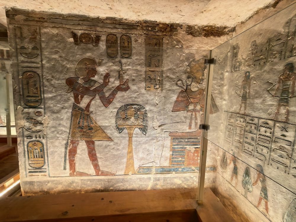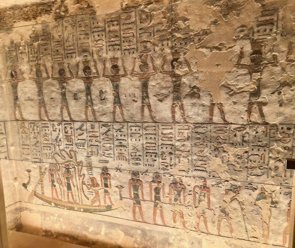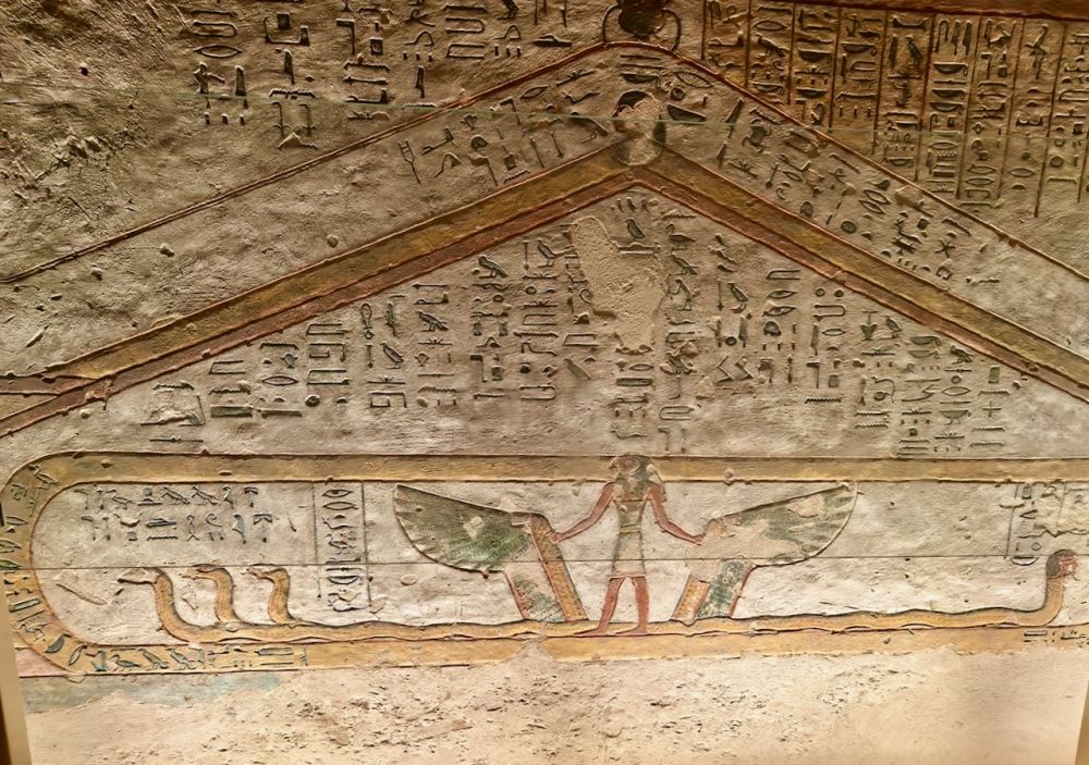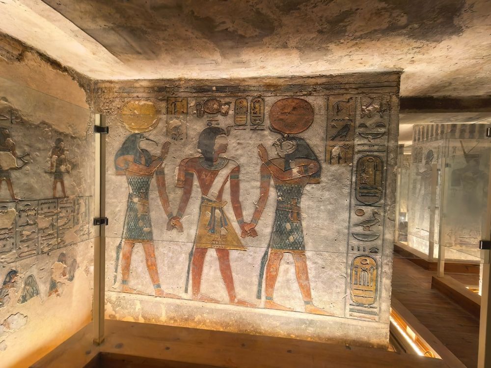 墓道里有大量壁画,除了《门之书》(Book of the Gates)、《大地之书》(Book of the Earth)、《冥界之书》(Book of Amduat)等丧葬文献作为死者灵魂穿越冥界的指南,还雕刻有《亡灵书》,生动地呈现法老的日常生活场景,例如美食、盔甲、财宝、以及阿拜多斯的朝圣之旅,这是每个埃及人都应该在生前或死后完成的朝拜。壁画雕刻细腻、色彩鲜艳、并保存完好,令人印象深刻。