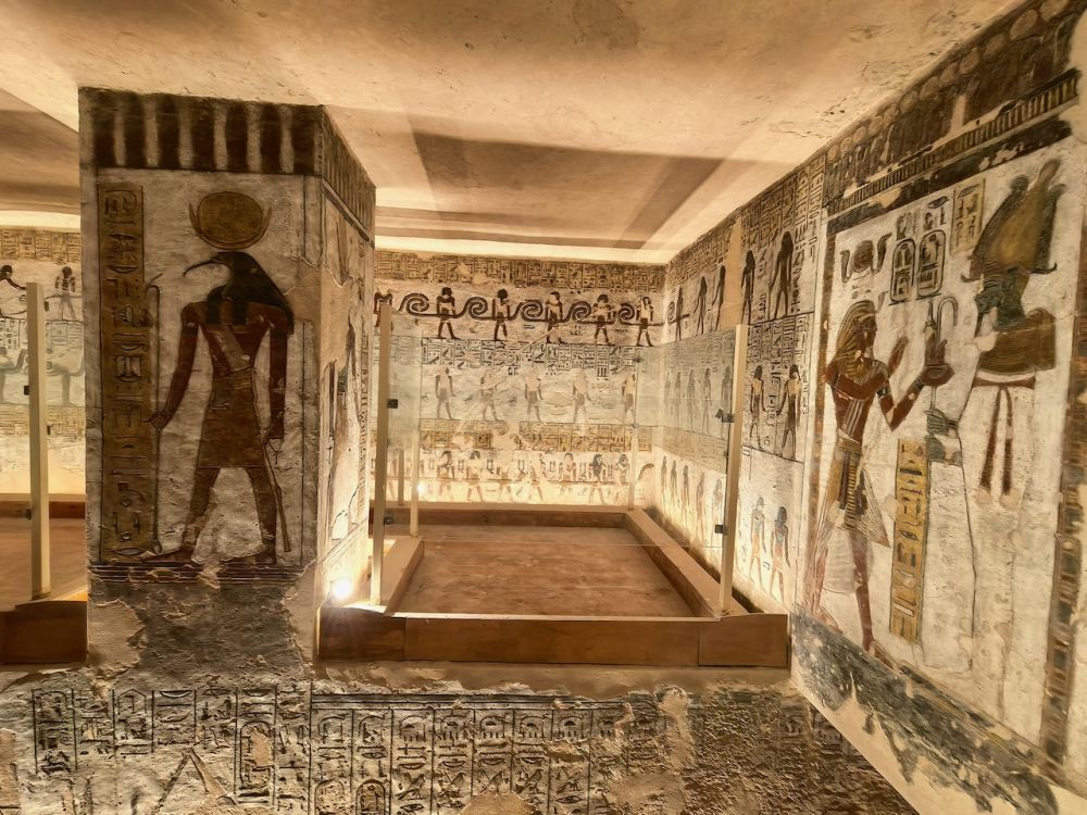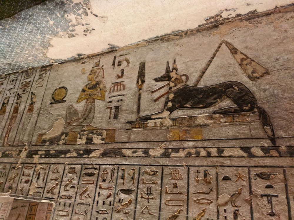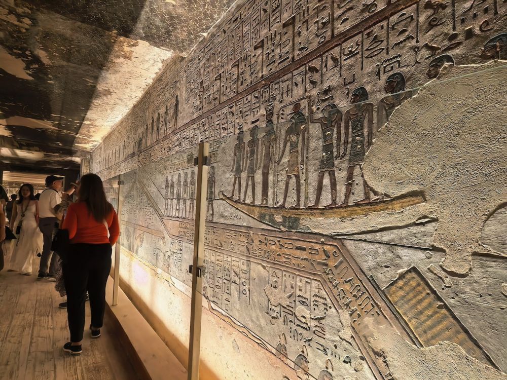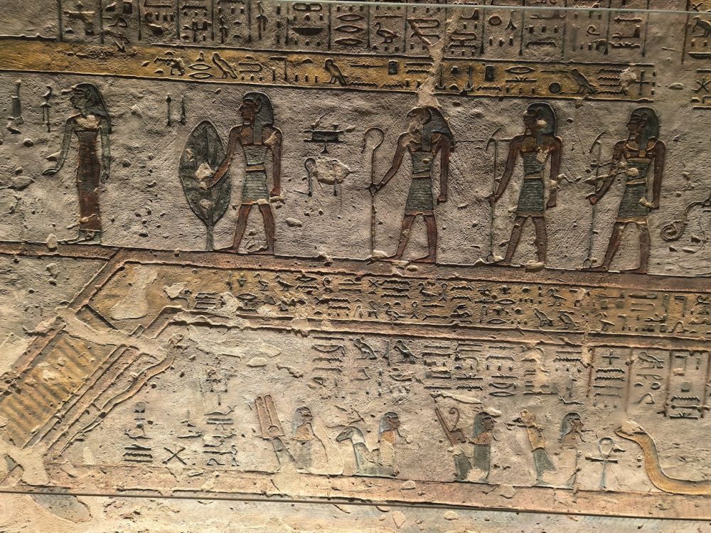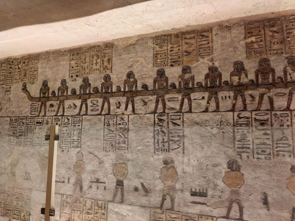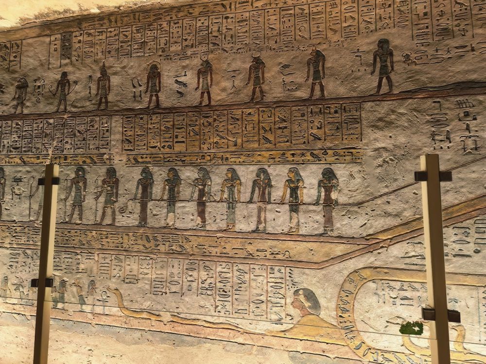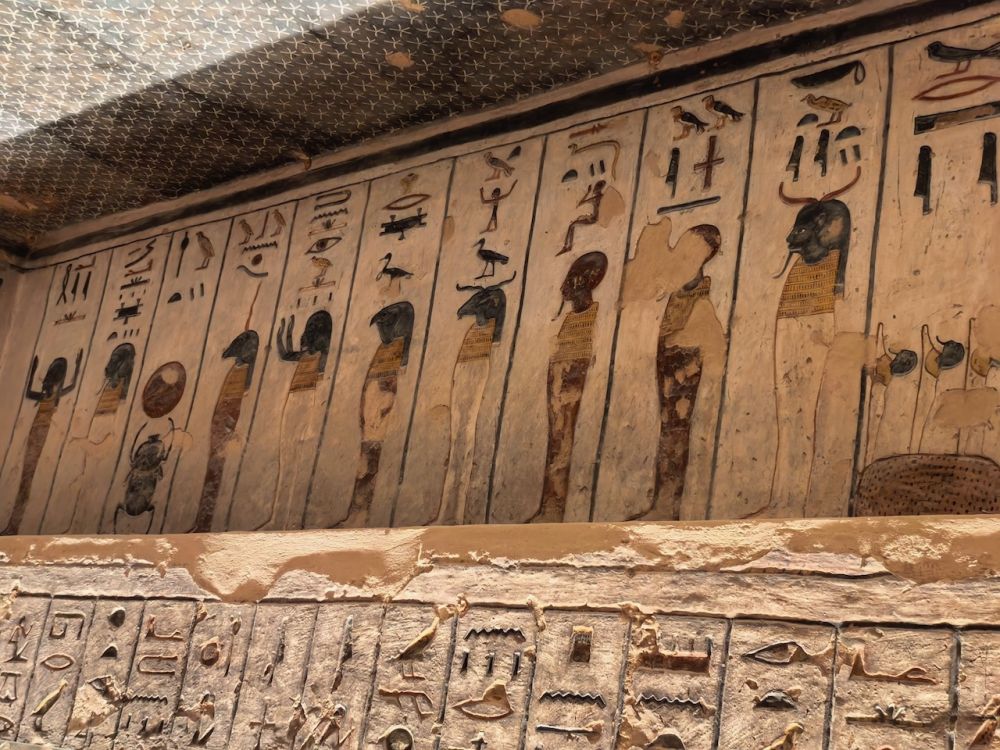 墓道里有大量壁画,除了《门之书》(Book of the Gates)、《大地之书》(Book of the Earth)、《冥界之书》(Book of Amduat)等丧葬文献作为死者灵魂穿越冥界的指南,还雕刻有《亡灵书》,生动地呈现法老的日常生活场景,例如美食、盔甲、财宝、以及阿拜多斯的朝圣之旅,这是每个埃及人都应该在生前或死后完成的朝拜。壁画雕刻细腻、色彩鲜艳、并保存完好,令人印象深刻。