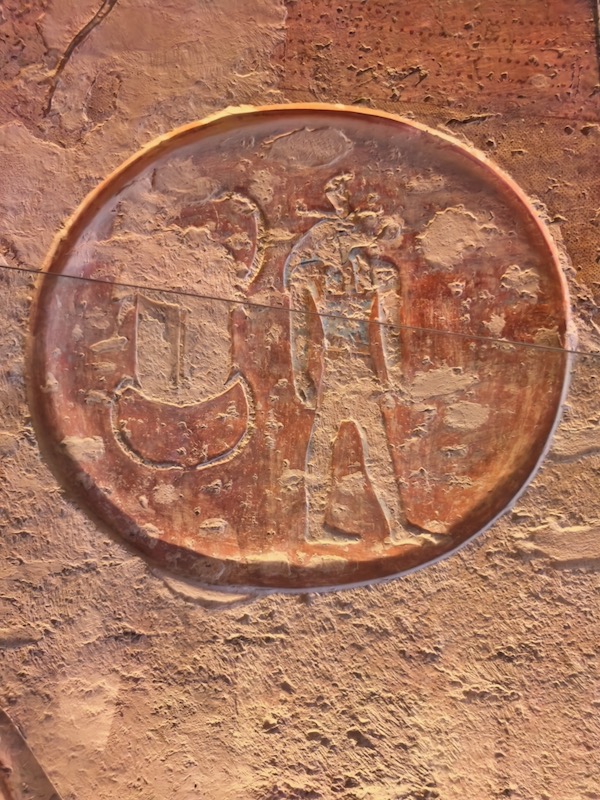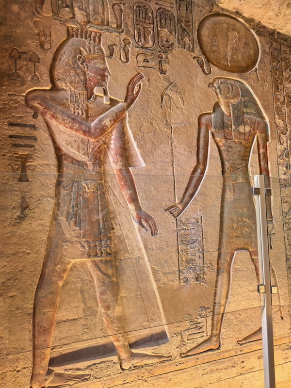 拉美西斯三世和托特(左)、拉-霍拉赫梯(Ra-Horakhty,右),拉-霍拉赫梯是古埃及一位强大的太阳神,它是拉神和地平线之神荷努斯的复合神,代表太阳运行的轨迹,从日出到日落的每日循环,象征重生和王权。托特是智慧之神,也是月亮、医药之神。