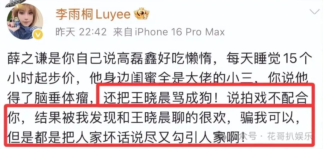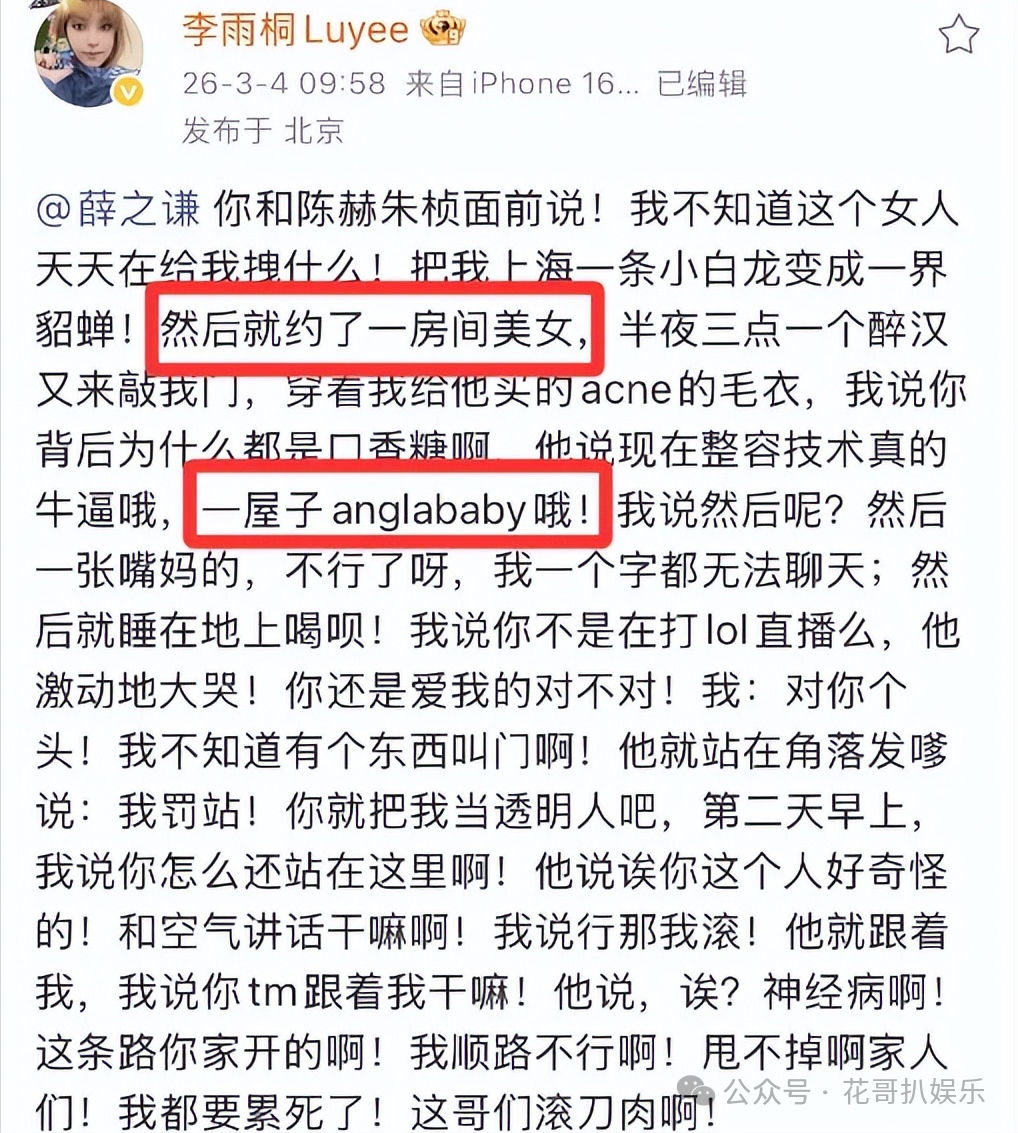不过和当年的雷神之锤不同,李雨桐此番爆料画风突变,言语混乱毫无逻辑,一会儿怒骂薛之谦精神状态堪忧,直指对方行为怪异。一会儿又爆料高磊鑫在薛之谦家中安装监控,全程掌控对方行踪。甚至放出下蛊这种离奇说法,称高磊鑫用非常规手段控制薛之谦,连她自己也受到影响。通篇发言颠三倒四,前后矛盾,没有任何实质证据支撑,全是情绪化宣泄,原本期待实锤的路人纷纷失望,愿意站队支持她的人少之又少,这场单方面控诉,反倒让薛之谦的陈年风流韵事被彻底扒出,每一条都足够颠覆三观。