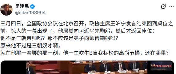 今年中共全国政协开幕式上,政协主席王沪宁讲话后归坐时,向党魁习近平低头弯腰致意。相关画面在网上流传,网民嘲讽中共体制把人变成“奴才”。