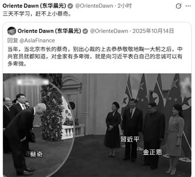 也有网民翻出另一名政治局常委蔡奇当年给习近平和金正恩弯腰鞠躬的镜头,嘲讽王沪宁“三天不学习,赶不上小蔡奇”。