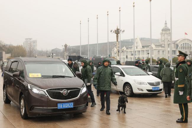 2026年3月4日,中共政协会议开幕前,众多保安人员牵着狗在人民大会堂外检查车辆。(Lintao Zhang/Getty Images)
