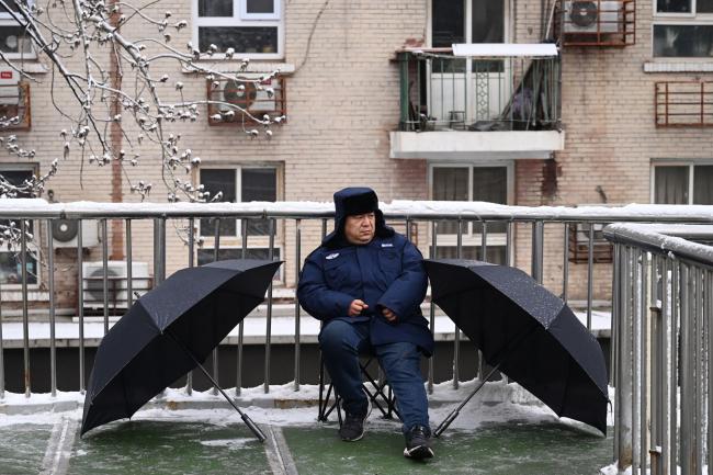 2026年3月5日,北京一个天桥上的保安人员。 (Greg Baker/AFP via Getty Images)