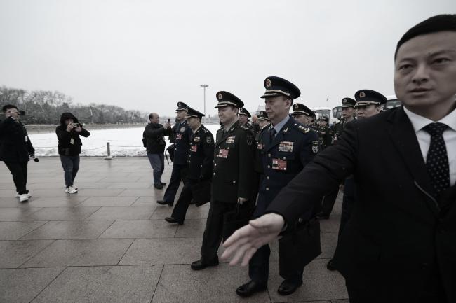 2026年3月5日,参加中共人大会议的军队代表抵达北京人民大会堂外。(Lintao Zhang/Getty Images)
