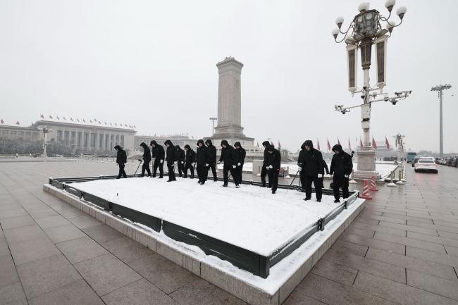3月4日,北京忽然降雪,尽管外人很难靠近大会堂和天安门广场,但两会保安们仍被要求检查积雪下面是否可能藏有危险品,画面相当另类。