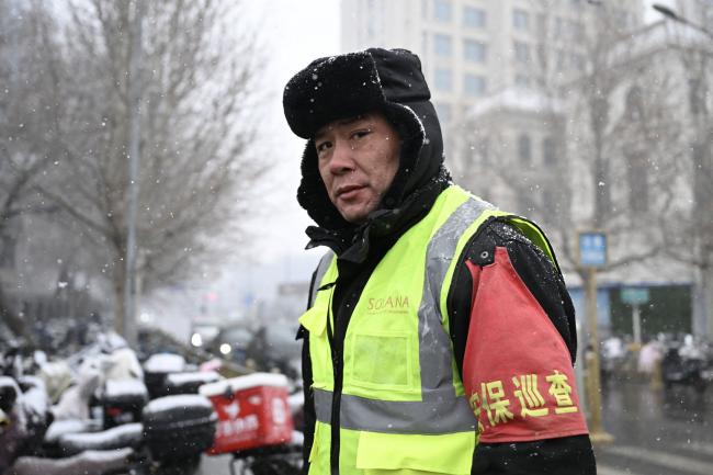 2026年3月4日,北京街头一名带红袖章的保安人员。(Pedro Pardo/AFP via Getty Images)