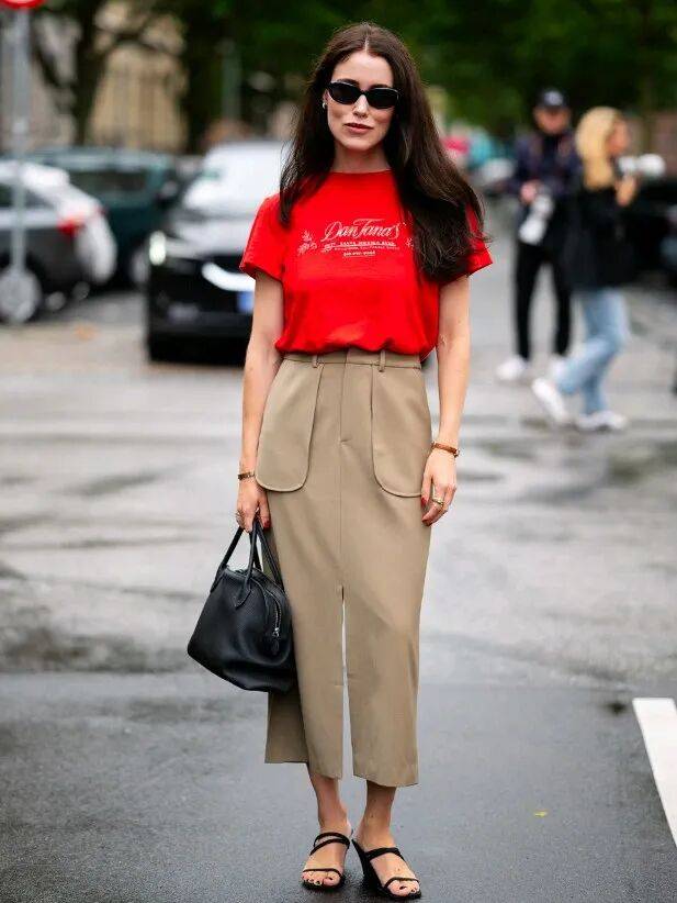 红色T恤,不仅提升整体气质,还能赋予了一种无声的力量,让人倍显挺拔,搭配一件卡其色工装半裙,这样的搭配还能彰显低调的奢华,穿上一双黑色凉鞋,下角塞药理不费力的塑造属于自己的好气质。