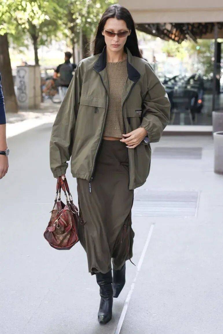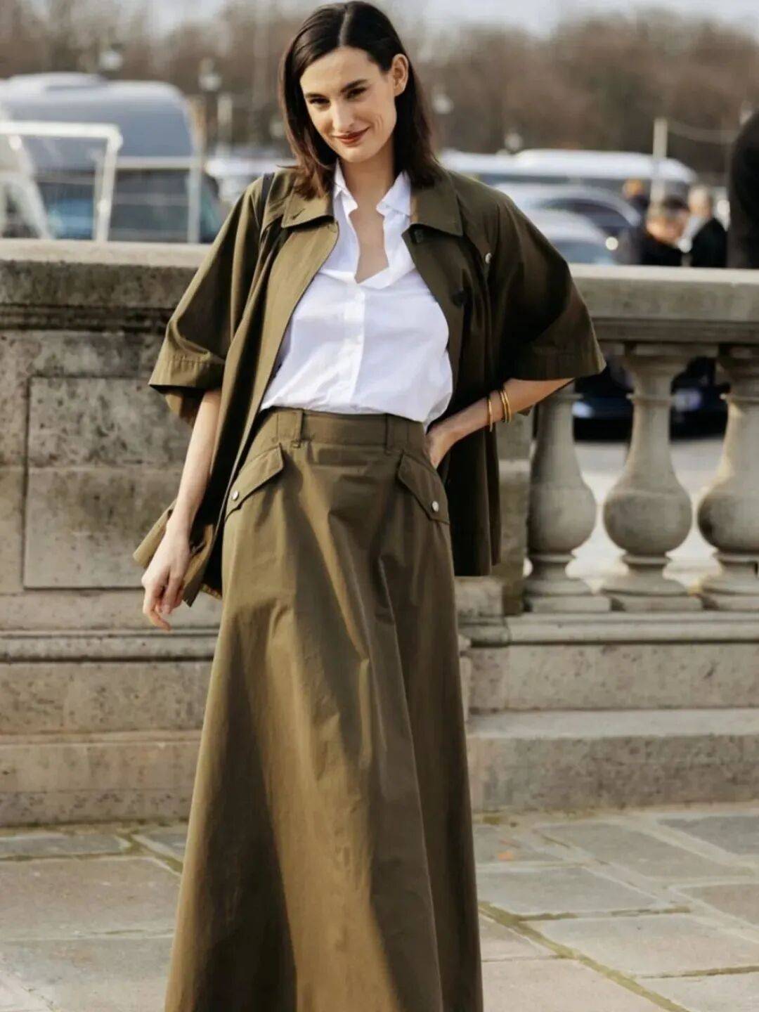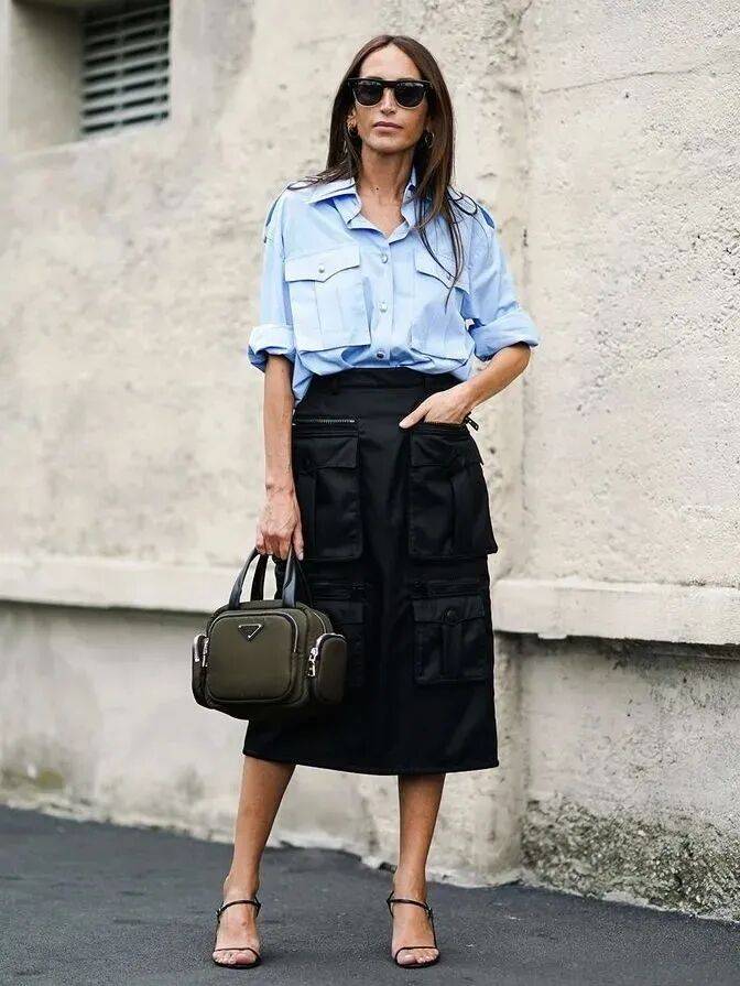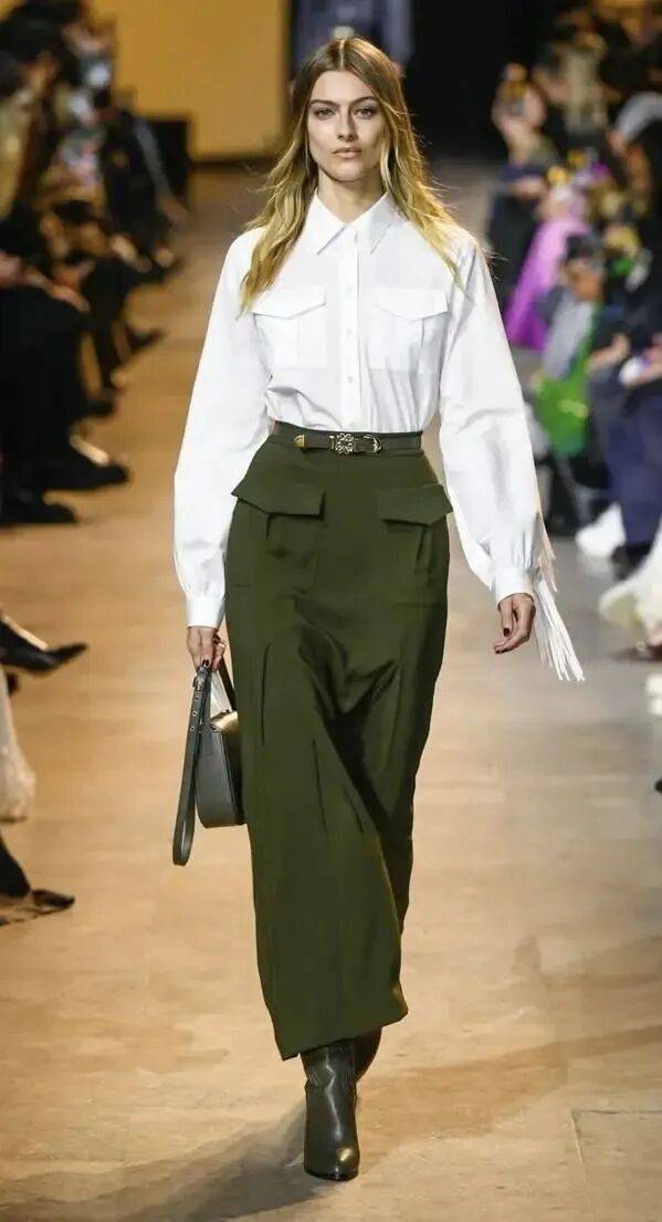 白色衬衫,能轻松穿出早春独有的休闲干练时髦感,瞬间营造出强大气场,搭配一件军绿色工装半裙,利落中带着飒爽,气场全开,下角塞腰里真的超显气质,搭配一双靴子,视觉上更显瘦复古又摩登