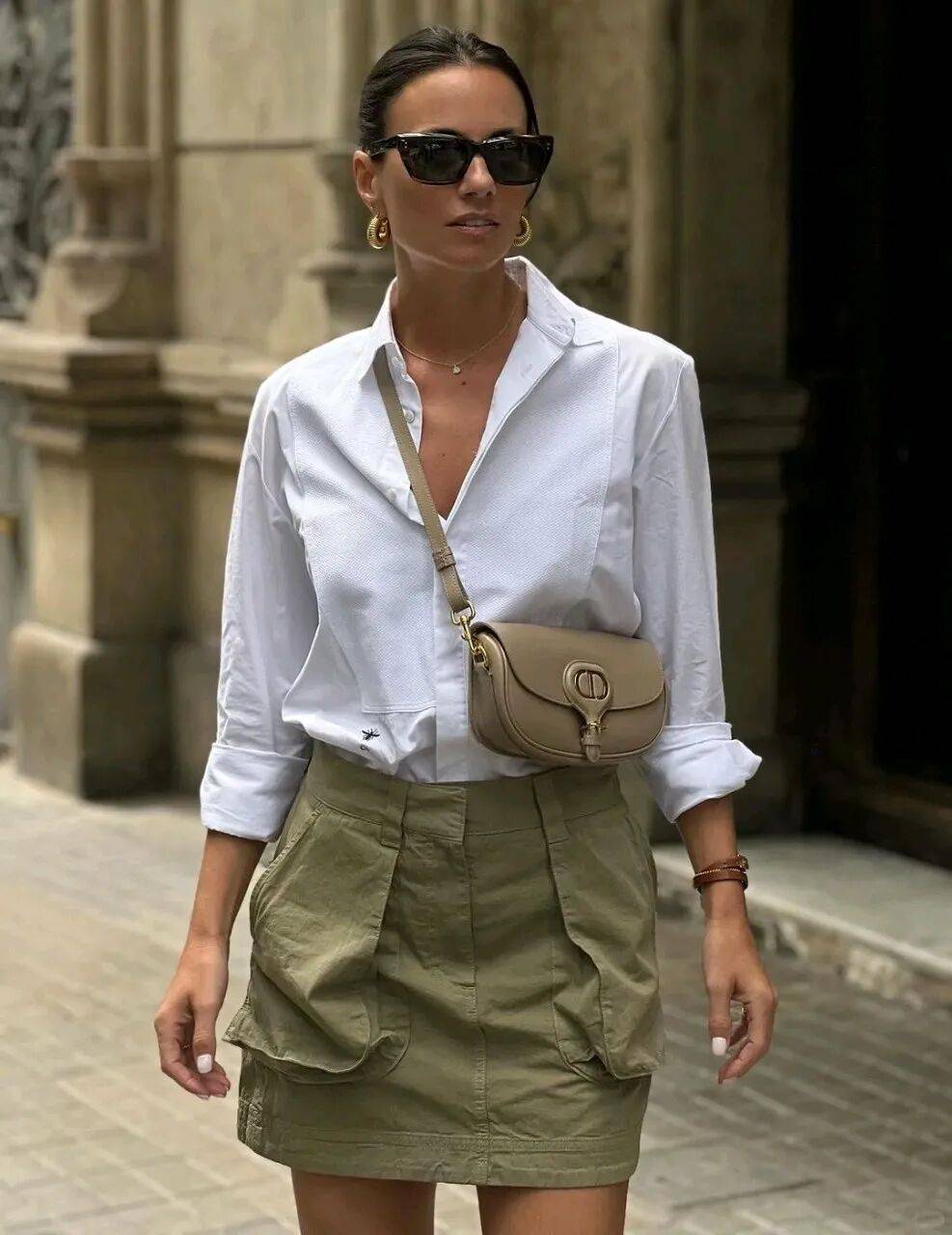 白色衬衫,白色能够塑造风格的大气让穿者看起来更有高级感,搭配一件卡其色工装半裙,瞬间让你脱颖而出下角塞腰里,充满了大女人的气场,下角塞腰里系上腰带,即使没有完美身材,也能穿出大气感!!