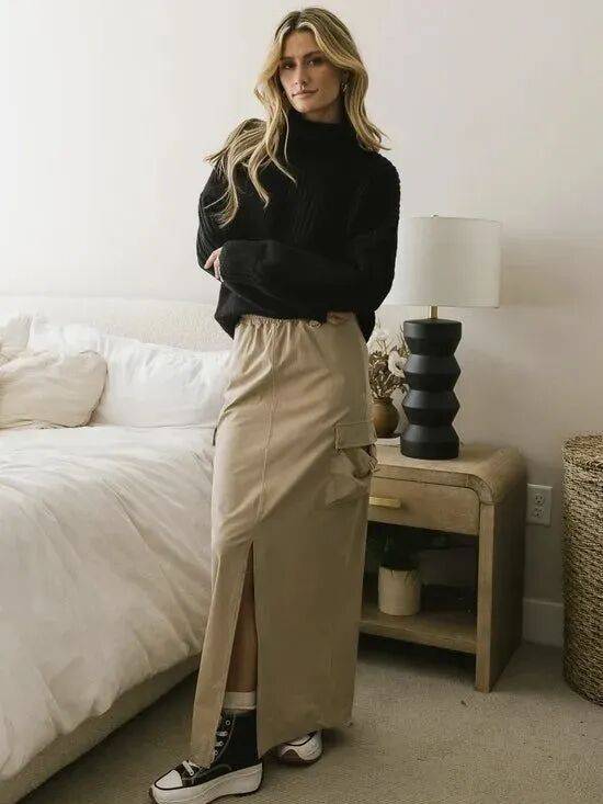 黑色立领针织毛衣,能塑造干练与力量感,还能轻松呈现女性的气质魅力,搭配一件卡其色工装半裙,让整个造型彰显大气,高级又时髦,穿上一双帆布鞋更是个性感十足, 更突显女性的智性高级感