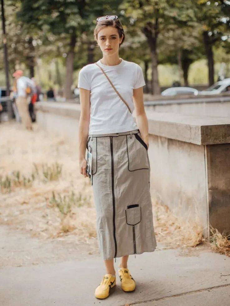 白色圆领T恤,容易给人亲近的感觉更是休闲感十足,搭配一件灰色工装半裙,能让你的整体穿搭更加和谐显干练女人味,搭配一双黄色运动鞋,有种恰到好处的随意,又彰显了个性