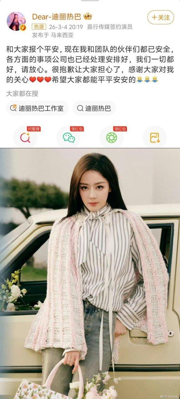 3月4日,演员迪丽热巴发微博报平安:和大家报个平安,现在我和团队的伙伴们都已安全,各方面的事项公司也已经处理安排好,我们一切都好,请放心。 很抱歉让大家担心了,感谢大家对我的关心,希望大家都能平平安安的。