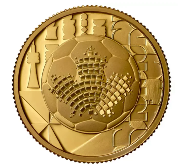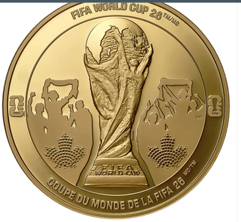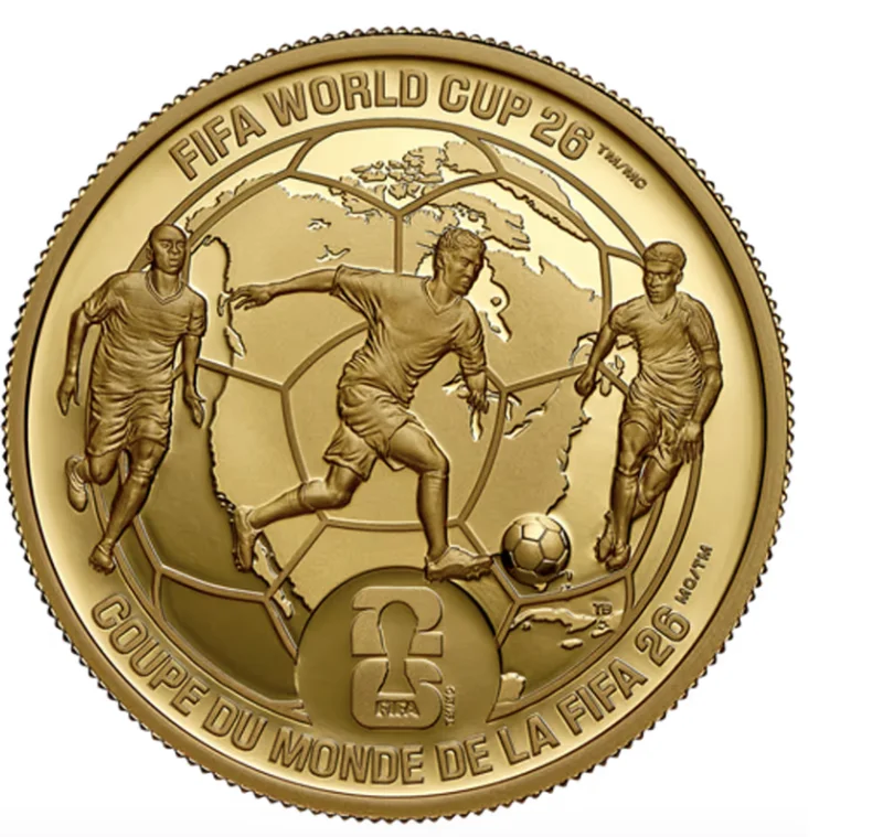 这枚面值100元的纯金币,是2026年FIFA世界杯系列中最便宜的金币,售价2,869.95元。硬币上印有足球图案,并融入了向主办城市多伦多和温哥华致敬的设计。
