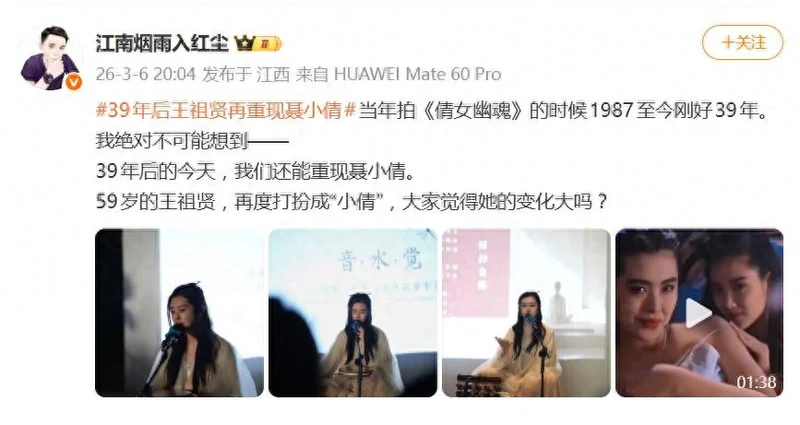 据网友3月6日晚间爆料,一袭白衣,长发垂肩,配上那对熟悉的珍珠耳环——当59岁的王祖贤在温哥华一场文化活动中,以经典的“聂小倩”造型亮相时,瞬间在中文互联网投下了一枚“回忆杀炸弹”。距离1987年版《倩女幽魂》惊艳世人已过去39年,这场跨越时空的“重逢”,迅速点燃了全网关于“时光是否败美人”的激烈辩论。