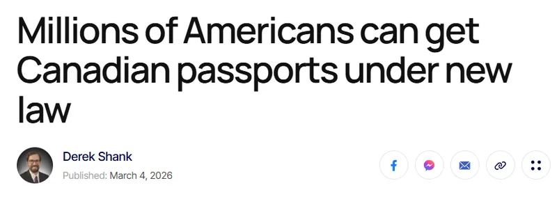根据加拿大最新生效的公民立法,数百万美国公民如今可能具备申请加拿大公民身份的资格,并可进一步申请加拿大护照。