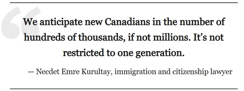 “新增加拿大公民人数可能达到数十万,甚至上百万,”他说,“这并不限于第一代海外出生者。” 自法律生效以来,他所在事务所已收到大量申请,整个过程繁琐而复杂。Kurultay 还表示,他从其他律师处也得知案件数量激增。
