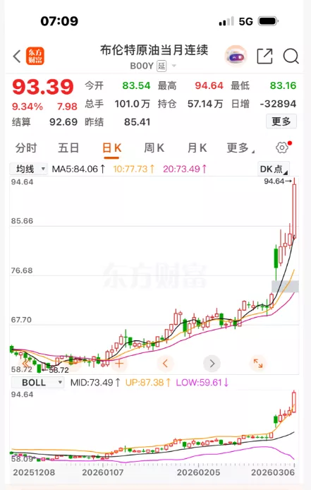 此次国内油价的大涨,主要原因就是美以与伊朗的军事冲突持续升级,导致目前中东原油出口严重受阻甚至差不多停滞,国际油价持续飙升。本轮调价周期内,布伦特原油期货已从70美元左右/桶飙涨到最高94.64美元/桶,纽约原油期货从65美元左右/桶飙升至最高92.61美元/桶,涨幅分别超过35%和42%。而上次国际油价出现这样疯涨的局面,则是2022年初俄乌冲突爆发的时候。