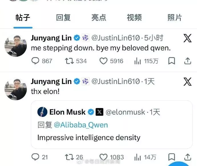 3月4日凌晨,千问核心负责人林俊旸在社交媒体发文称:me stepping down. bye my beloved qwen.(我卸任了。再见了,我亲爱的千问。)