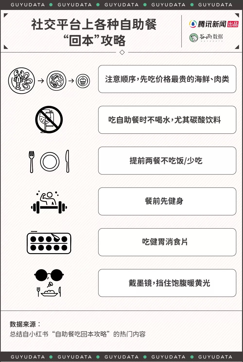 为了贯彻“少吃一口亏,多吃一口赚”的自助真理,大家各显神通,有人提前吃健胃消食片,有人戴墨镜对抗暖色灯光带来的饱腹感。这些攻略或许未必科学,但却提供了心理暗示和某种安慰。