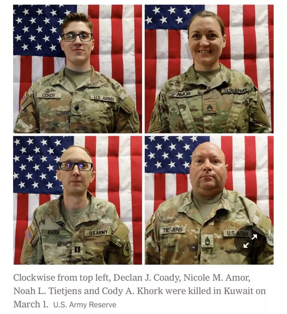 ■之前漏了这个重要信息,3月4日美军公布了4名阵亡军人身份。分别为科迪·A·霍克、妮可·M·阿莫尔、德克兰·J·科迪和诺亚·L·蒂特延斯。袭击中另外两名遇难军人身份尚未公布。