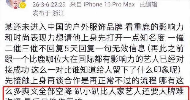 多位业内人士及合作方反馈,鹿晗部分代言合约到期后未得到及时跟进,有意向的合作方难以通过正常渠道对接工作室工作人员,部分项目甚至需要通过鹿晗个人社交账号进行沟通推进。这种非常规的对接方式,直接影响合作效率与商业资源稳定。