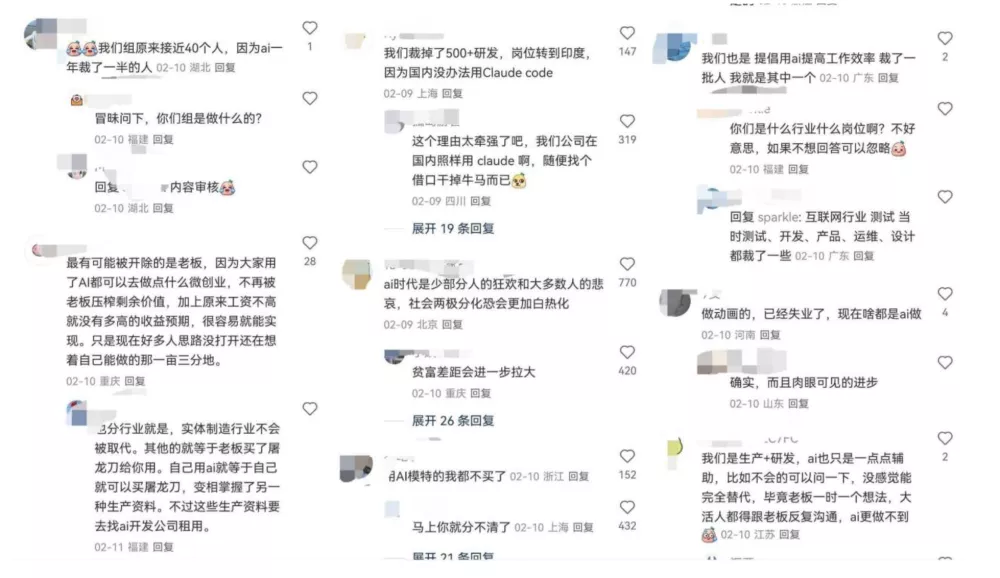 一位叫“愚公”的网友说,“我30岁,春节前被裁了,老板说,再招几个会AI的大学生就行。”还有个叫“小铁匠”的程序员感慨自己快失业了,“很可怕,我3天的活,AI不到10分钟干完。”。