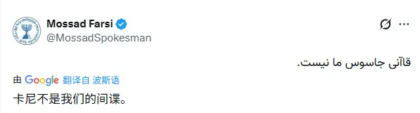 对此,2025 年 6 月 30 日,一个与摩萨德关联的 X账号,曾发布一条仅 6 个波斯语单词的帖文,直译为“卡尼不是我们的间谍”。