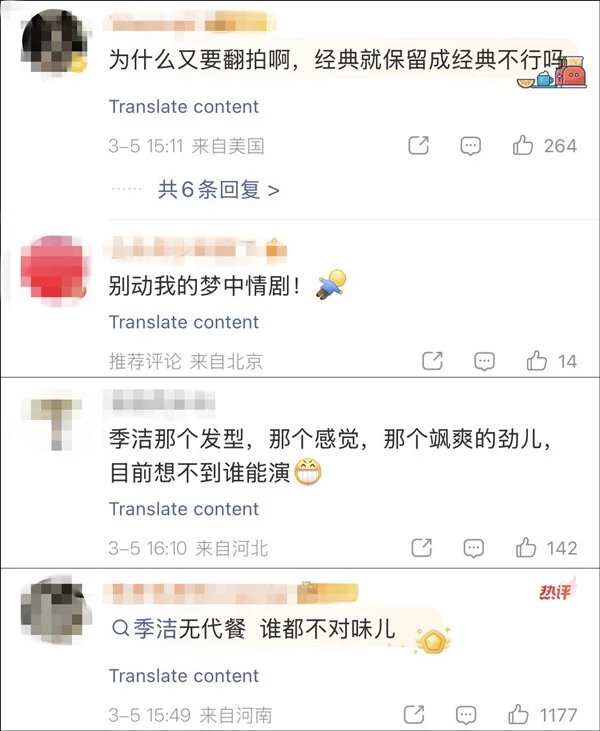 对于翻拍的消息,3月6日,原版编剧兼季洁扮演者王茜在微博晒出“我不知道”四连表情包做出回应。