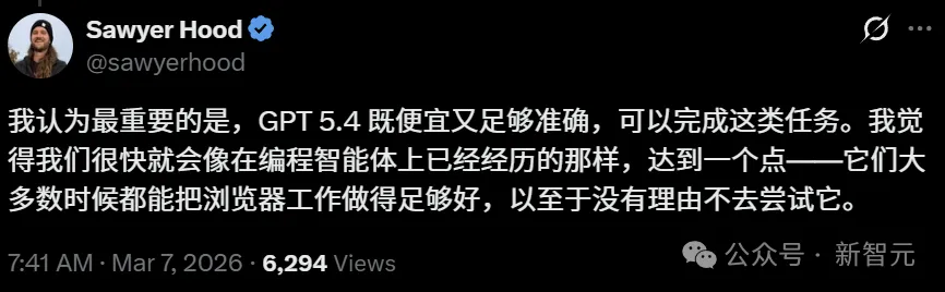 所有的浏览器工作,GPT-5.4都能胜任,而且它又准又便宜!可以确信,像编程智能体那样的白领革命,马上会再发生一遍。