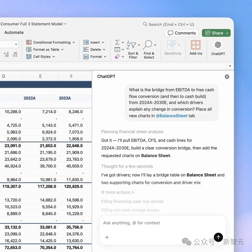 而且,搭载GPT-5.4的ChatGPT插件,已经可以直接在Excel中使用了!
